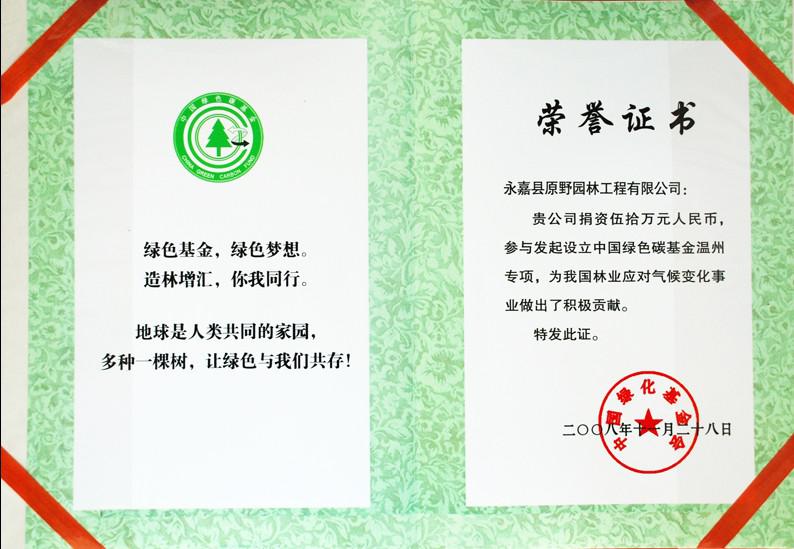 2008年捐贈50萬元參與發(fā)起設(shè)計中國綠色碳基金溫州專項,為我國林業(yè)應(yīng)對氣候變化失業(yè)做出了積極貢獻。