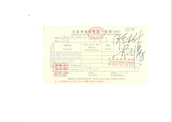 2013年向工商聯(lián)分會(huì)永嘉縣文化與遺產(chǎn)傳承保護(hù)發(fā)展基金捐款50萬元