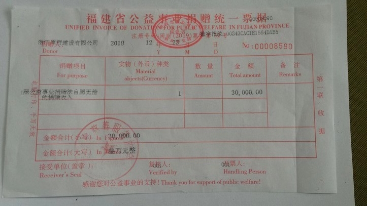 2019年向福建省慈善服務(wù)協(xié)會(huì)捐款叁萬(wàn)元