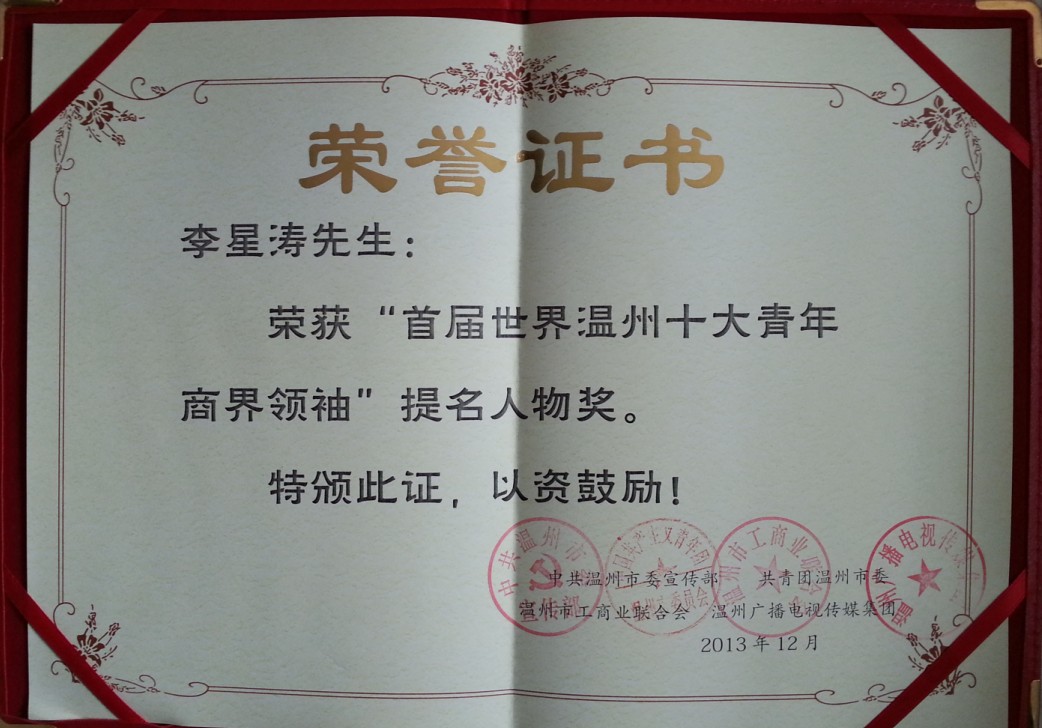 12月18日,首屆世界溫州十大青年商界領(lǐng)袖頒獎典禮在溫州大劇院舉行,李星濤榮獲首屆世界溫州十大青年商界領(lǐng)袖提名人物獎。本次評選活動由中共溫州市委宣傳部、共青團溫州市委、溫州市工商業(yè)聯(lián)合會、溫州廣播電視傳媒集團聯(lián)合舉辦。