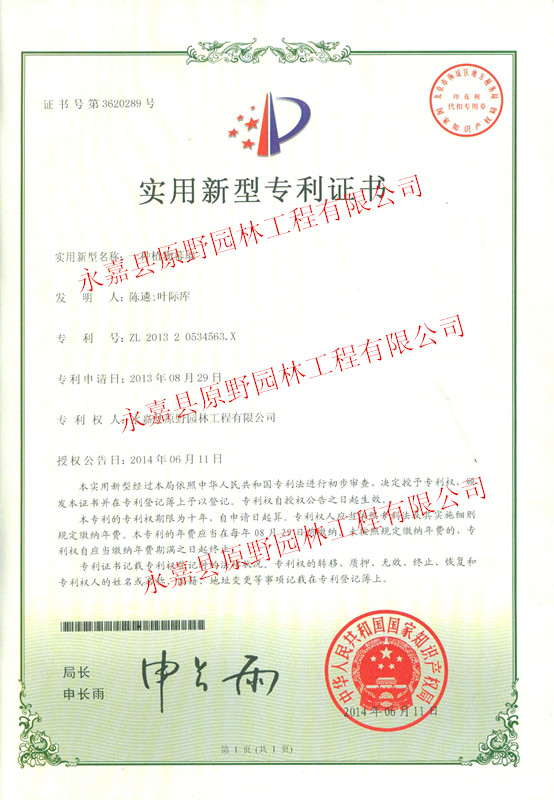 2014-06-306月28日,原野公司收到實(shí)用新型專利證書。專利名稱為一種植物幕墻,由原野公司陳遴、葉際庫發(fā)明。
