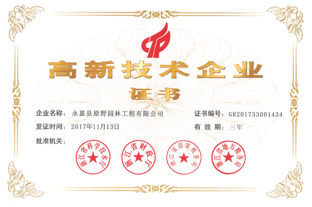 2018-01-092018新年伊始,原野園林也迎來了新年的第一個榮譽,成功通過了國家高新技術(shù)企業(yè)認定。2018年1月9日,公司收到了由浙江省科學技術(shù)廳、浙江省財政廳、浙江省國家稅務局、浙江省地方稅務局聯(lián)合頒發(fā)的“國家高新技術(shù)企業(yè)”認定證書,由此正式邁進國家高新技術(shù)企業(yè)行列。