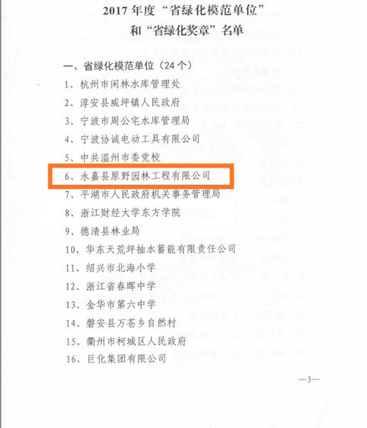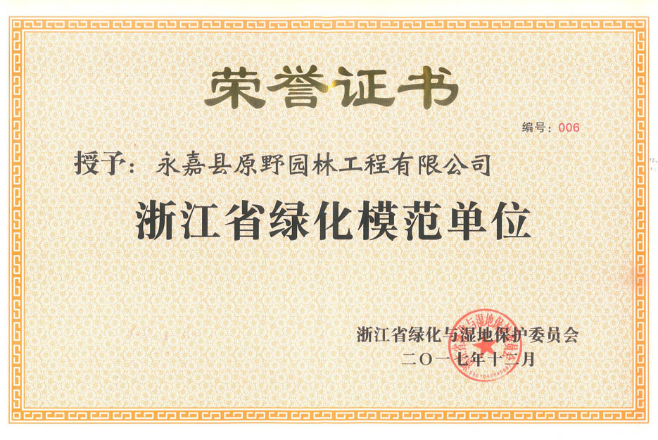 2018-03-03日前,浙江省綠化與濕地保護委員會正式公布了2017年度“省綠化模范單位”名單,永嘉縣原野園林工程有限公司名列其中,這是原野在綠化工作方面創(chuàng)建的又一個省級榮譽。