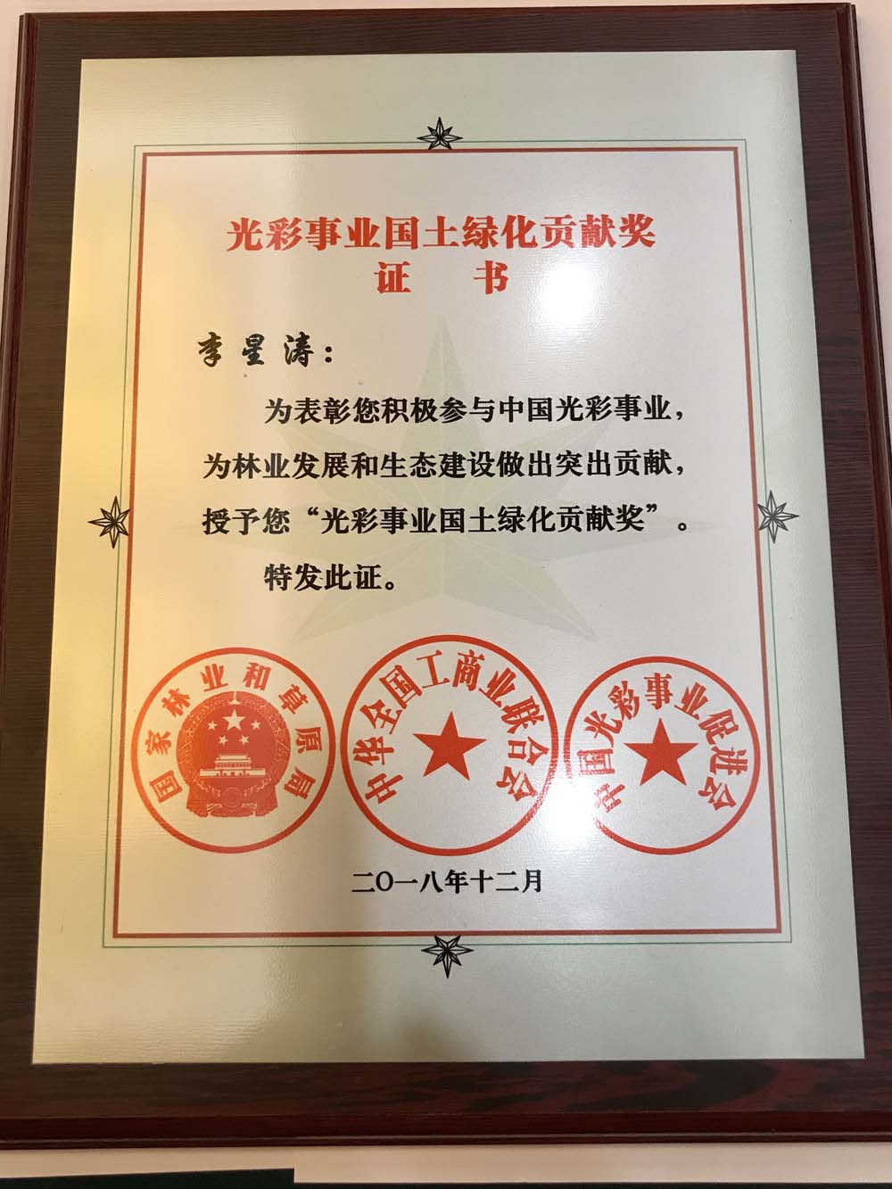 2018-12-2912月27日,第七屆“光彩事業(yè)國土綠化貢獻獎”在北京舉行頒獎儀式,原野農業(yè)集團董事長李星濤獲此殊榮?!?/span>