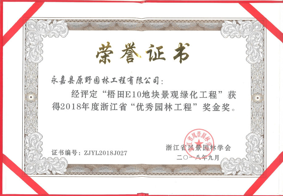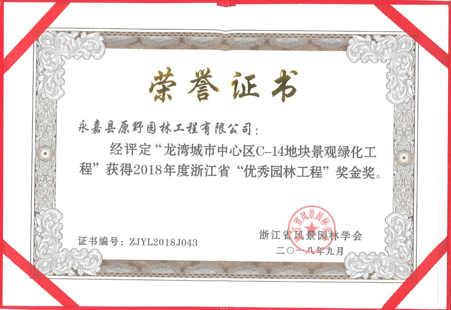 2018-12-3012月21日,浙江省第八屆“園林人居”論壇暨2018年“優(yōu)秀園林工程”獎頒獎大會在杭州舉行。原野建設承建的“龍灣城市中心區(qū)c-14地塊工程”(以下簡稱C14)、“梧田E10地塊景觀綠化工程”(以下簡稱E10)、“永嘉縣行政中心建設工程景觀綠化工程”(以下簡稱行政中心建設)三個項目分別獲得2018年度浙江省“優(yōu)秀園林工程獎”金獎。