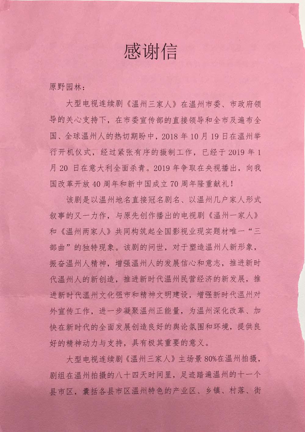 2019120日大型電視連續(xù)劇在意大利全面殺青。該劇于20181019日在溫州舉行開機(jī)儀式,計劃2019年在央視播出,向我國改革開放40周年和新中國成立70周年隆重獻(xiàn)禮!劇中重要劇情在原野農(nóng)莊拍攝。