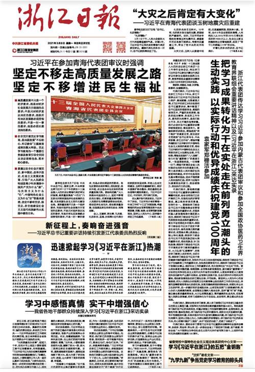 2021-03-09浙江日報、浙江新聞客戶端近日連續(xù)轉載《學習時報》的《習近平在浙江》采訪實錄。真摯的為民情懷、強烈的責任擔當、務實的工作作風……習近平同志在浙江工作期間的光輝歷程,連日來持續(xù)在全省各地干部群眾中引發(fā)熱烈反響。