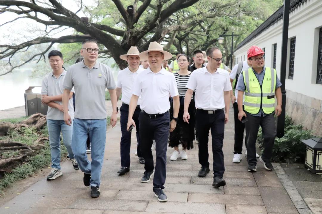 考察團來到江心嶼東園,一路經(jīng)過清輝浴光、荷風柳月、榕林詩徑、溫州近代開埠史館等景點,感受傳統(tǒng)甌越空間文化底蘊和優(yōu)美意境。南宋風格的亭臺樓閣、古樸深厚的石板路面、精心設(shè)計的樹石花木、蔥郁挺拔的參天榕樹......這些景觀共同構(gòu)成一幅簡樸清凈的甌越園林畫面。