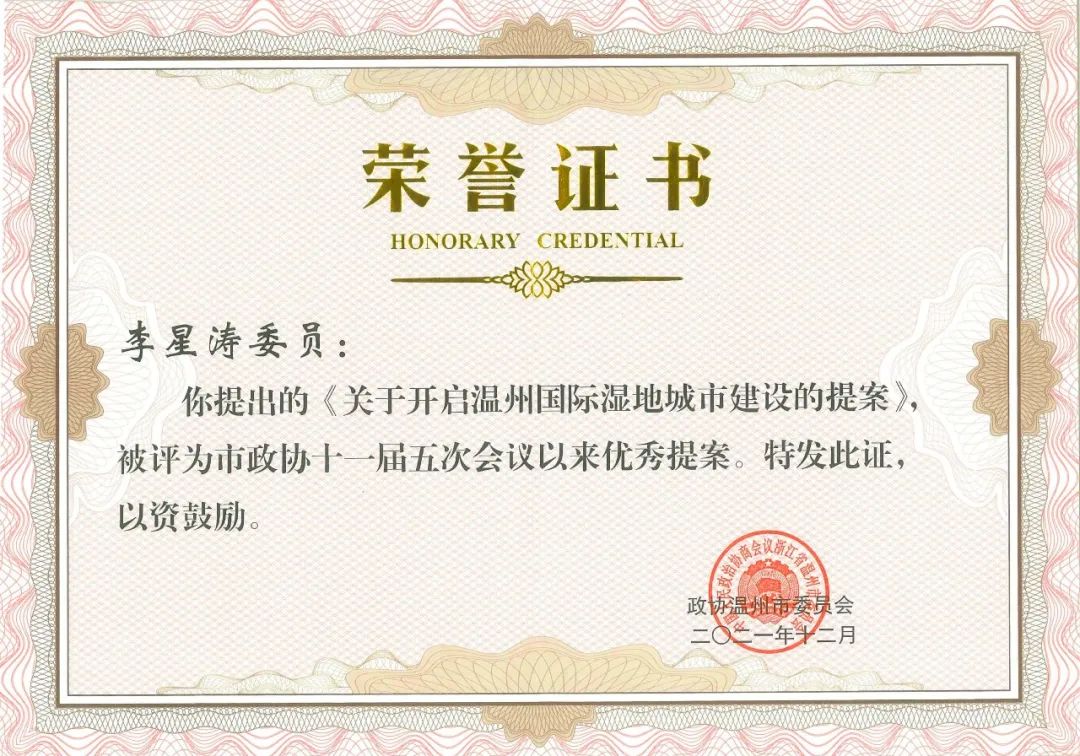 2022-01-04日前,李星濤榮獲市政協(xié)溫州市委員會(huì)優(yōu)秀提案榮譽(yù)。