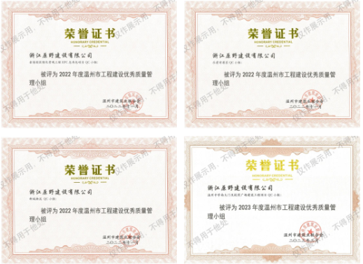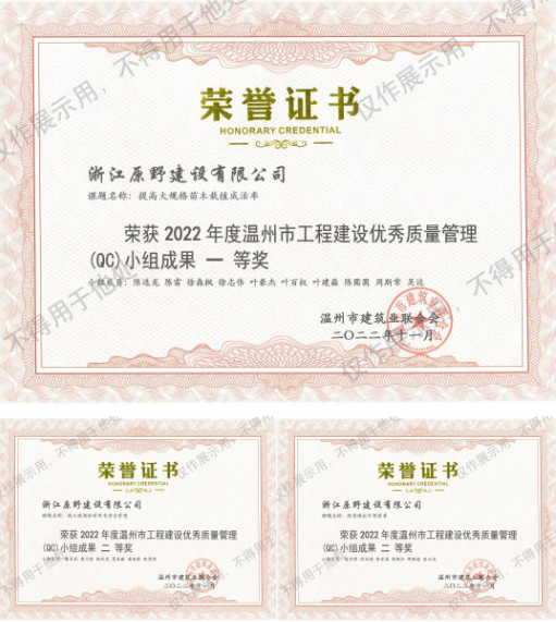 其中,《提高大規(guī)格苗木栽植成活率》課題榮獲2022年度溫州市工程建設優(yōu)秀質(zhì)量管理QC小組一等獎,《橋梁墩柱外觀質(zhì)量》、《施工現(xiàn)場臨時用電安全管理》等兩個課題榮獲二等獎;金海園區(qū)綠化景觀工程EPC總承包項目QC小組、樂清灣港區(qū)QC小組、新城物流QC小組、溫州中學南大門及校前廣場建設工程項目QC小組榮獲溫州市工程建設優(yōu)秀質(zhì)量管理小組。