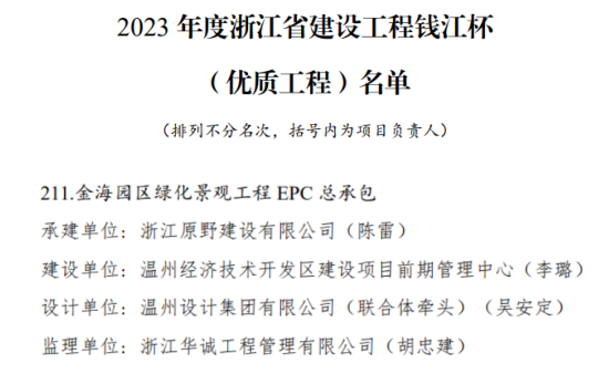 2023-08-188月15日,由浙江原野建設(shè)有限公司承建的金海園區(qū)綠化景觀工程EPC總承包項(xiàng)目,獲評2023年度浙江省建設(shè)工程錢江杯(優(yōu)質(zhì)工程)。錢江杯優(yōu)質(zhì)工程獎是浙江省建設(shè)工程質(zhì)量最高獎項(xiàng)。