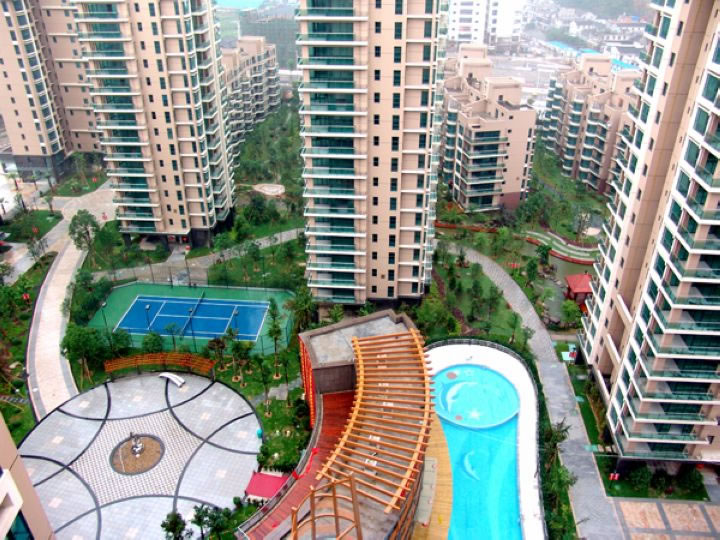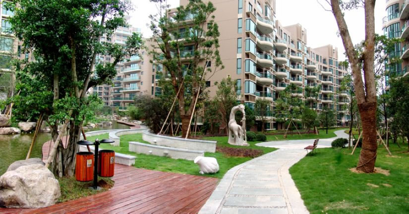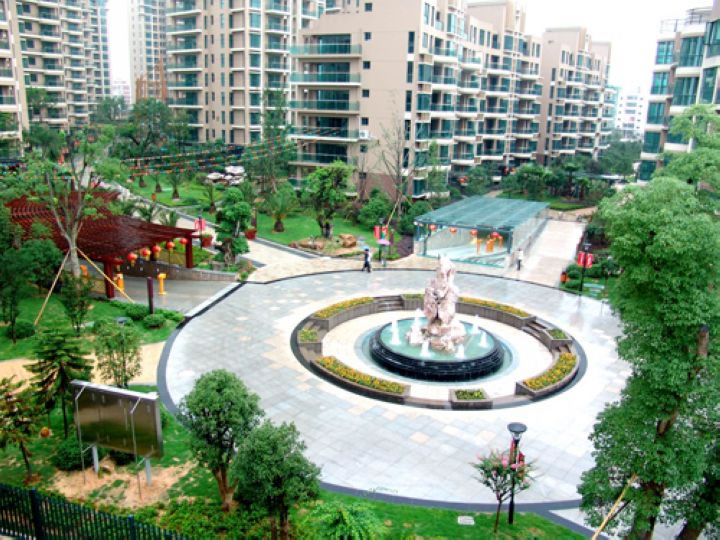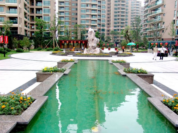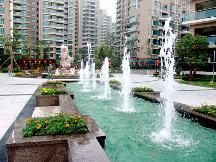 中西方藝術(shù)交融的中庭景觀、氣勢(shì)恢宏的中央軸心噴水渠營造水綠相接的自然住宅景觀