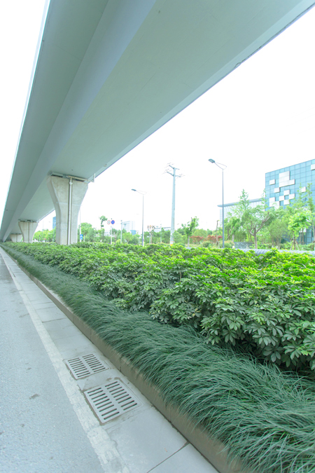 沿線綠化粗中有細(xì)帶著變化。中分線綠化帶在高架橋下蜿蜒出一條綠帶:八角金盤、灑金珊瑚等地被植物與海桐、山茶相間,耐陰植物組成不同景觀色塊和植物層次;橋墩周圍被中華常春藤等藤蔓植物包圍,等著春天發(fā)芽生長,兩邊側(cè)分帶的植物更顯得多樣多彩。