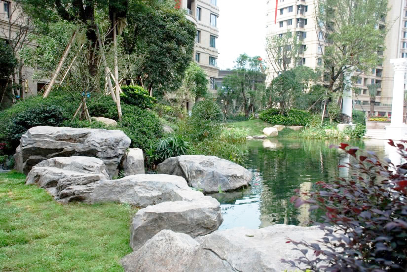 自然、真切、和諧的宜居景觀小品,疊合塑石假山與流動水系的生物循環(huán)構(gòu)建綠化、和諧、綠意的庭園景觀。 榮獲2014年中國優(yōu)秀園林工程金獎。